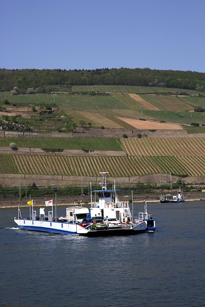 試乗コースの途中にはこのようにライン川をフェリーで渡ります。時間にして15分くらい、橋の代わりなので住んでいる人たちも利用します。ワイン用のブドウ畑を背にしての眺めはなかなかのものです。